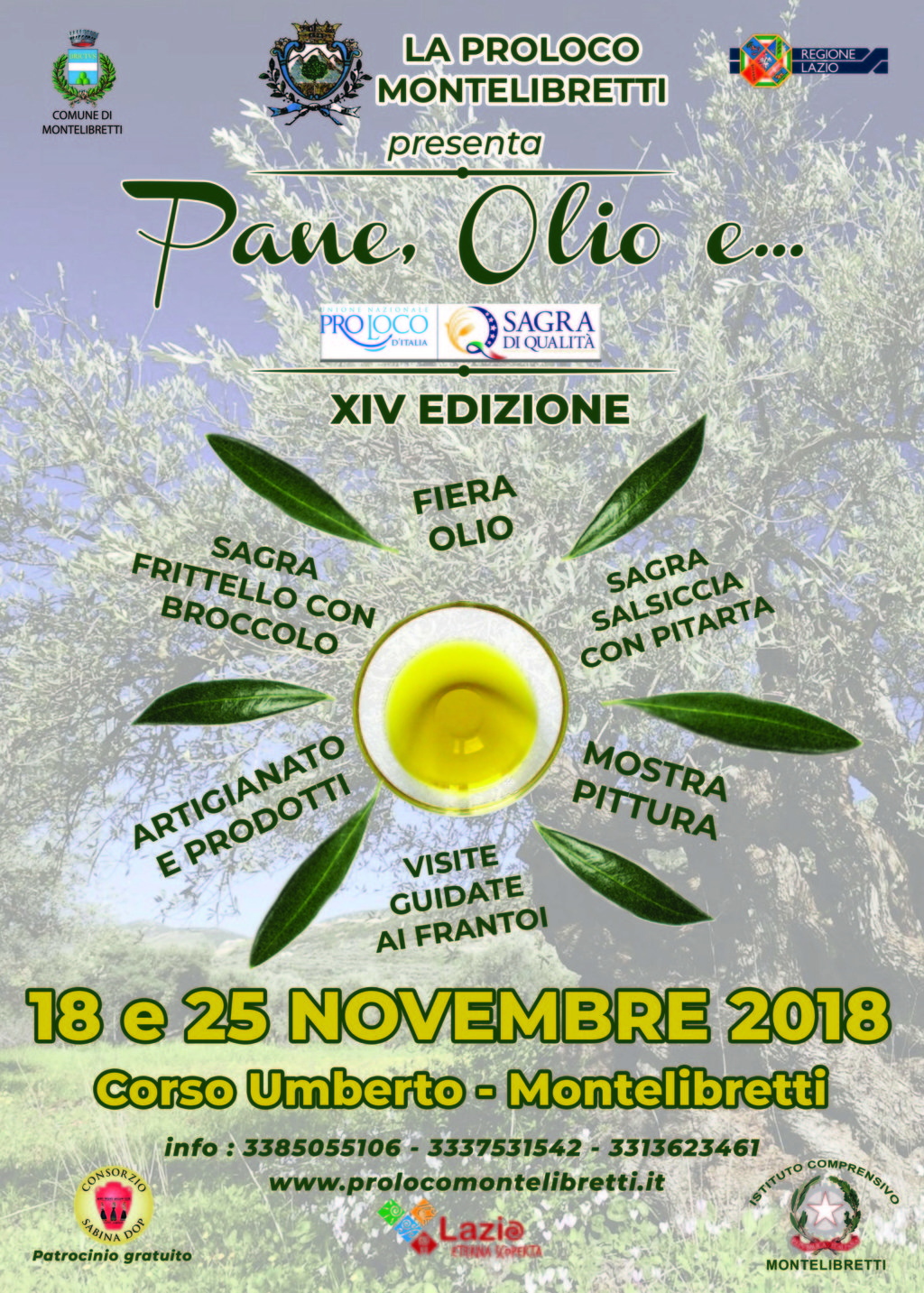 Ore 16.00: (Aula Consiliare) Premiazione “IL MIO ORO VERDE” concorso riservato alle aziende olearie di Montelibretti, in collaborazione con il CONSORZIO “SABINA DOP”.