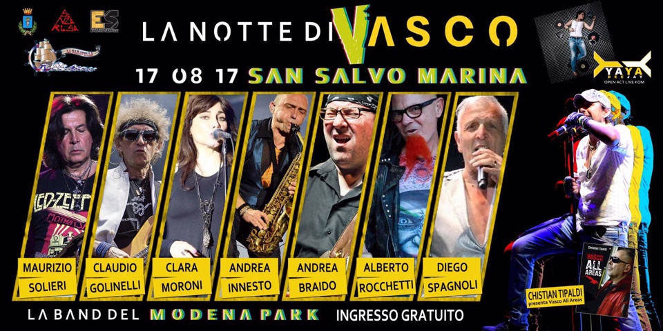 Si terrà il 17 agosto prossimo la terza edizione de “La Notte di Vasco” a San Salvo Marina. I musicisti ufficiali di Vasco Rossi, direttamente dal palco del Modena Park, concerto che si è aggiudicato il record mondiale per numero di presenze, si ritroveranno a San Salvo capitanati dalla voce di Antonio Renzone dei Senza Resa, una delle più apprezzate cover band del Blasco nazionale.