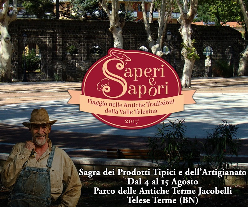 La Prima Edizione della Manifestazione culturale “Saperi e Sapori…Antiche tradizioni della Valle Telesina” si svolge da venerdì 4 agosto a martedì 15 agosto 2017 a Telese Terme, nel parco delle Antiche Terme Jacobelli, luogo ricco di verde per piacevoli passeggiate ombrose, vero e proprio parco naturale, dove ancora oggi si possono osservare i resti delle cabine private per la balneazione, due piscine di acqua sulfurea e la bouvette.
